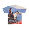 An all-over print unisex tee featuring the REALITY AWAITS cover art. Cowboy on the front and continuation of the sweeping landscape on the back with a Magna logo at top of the back neck.
